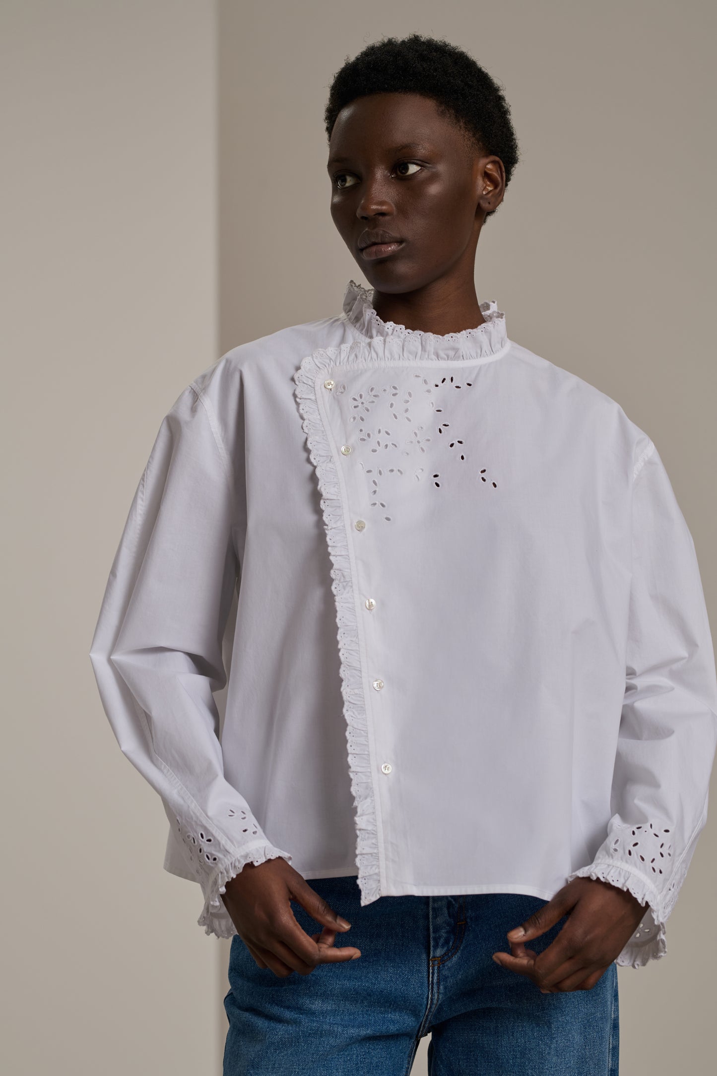 CLAUDIA is a straight-cut cotton poplin shirt. The buttoned opening at the collar, combined with a decorative placket, adds a distinctive and sophisticated touch, perfect for enhancing your everyday outfits.