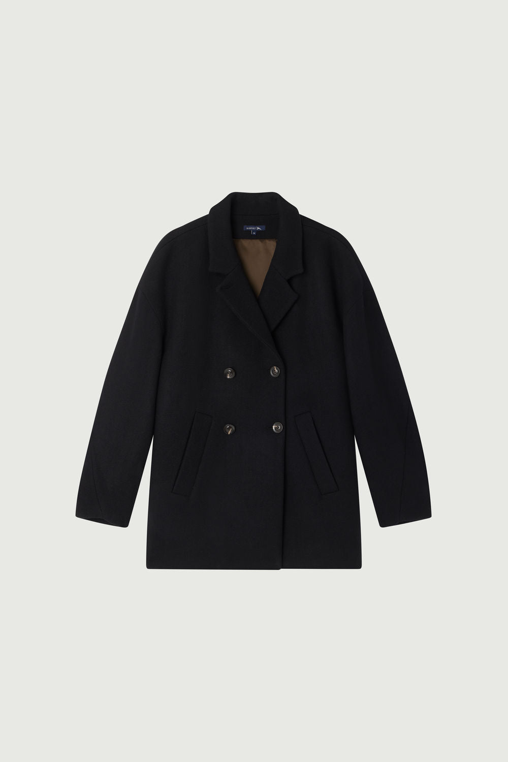 SALFORD is a short pea coat with a loose and round shape. Crafted from black double wool tweed. It can be worn with the collar open or closed. Featuring a double-breasted design and two front welt pockets, it combines elegance and timelessness with round sleeves for optimal comfort.