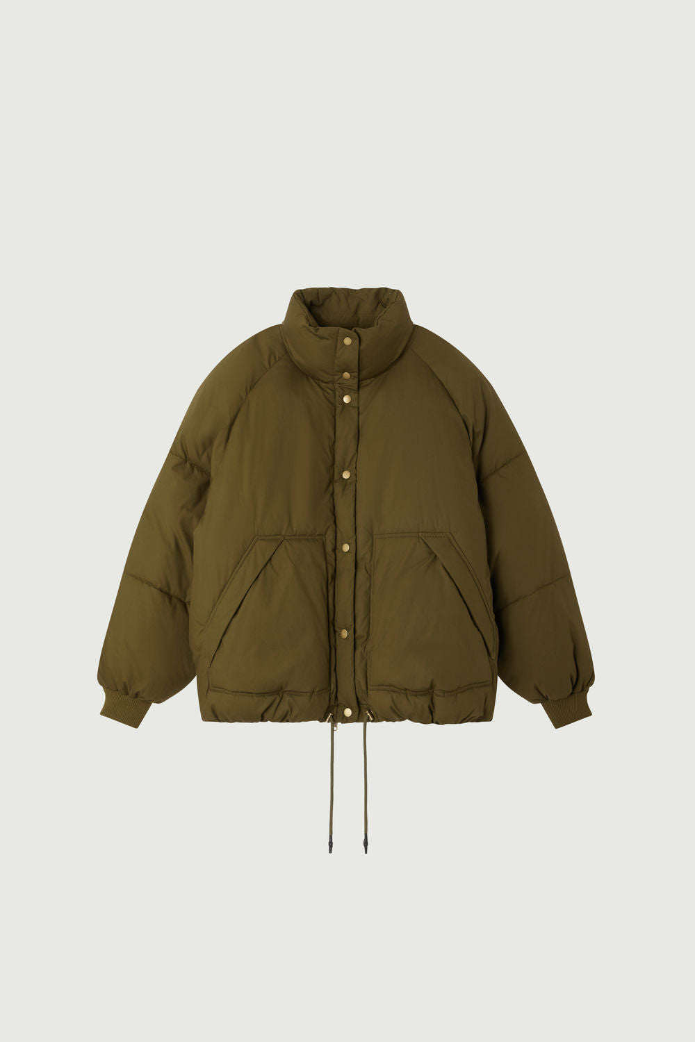 WING is a short puffer jacket in water-repellent poplin in a shade of khaki. It features long raglan sleeves and a concealed zip and button placket. The topstitched raglan pockets, with fleece linings, add warmth and functionality, while the hem is adjustable with a drawstring for a perfect fit.