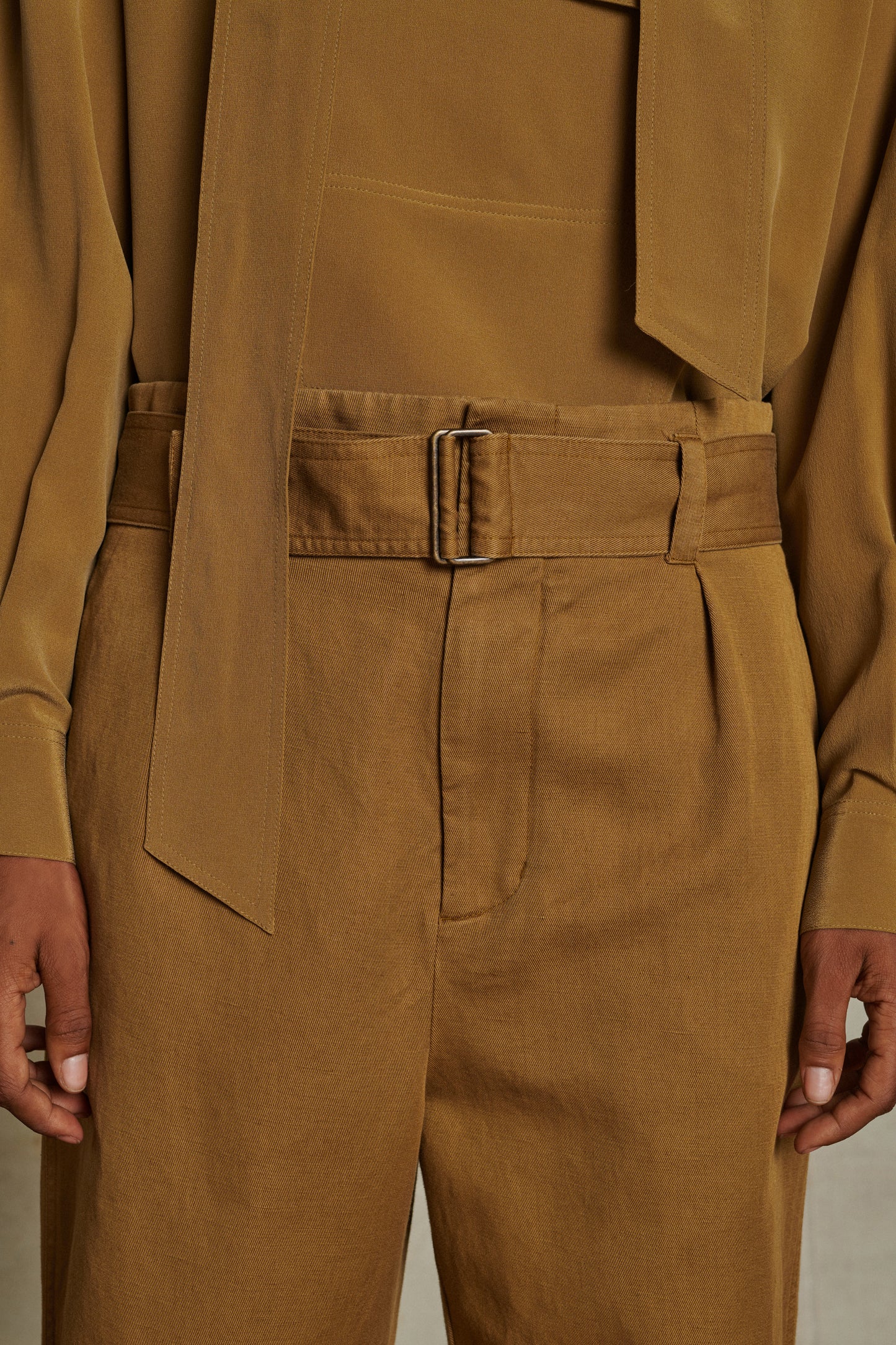 Questa miscela di cotone e lino crea una fabbricazione morbida, fine e leggera perfetta per la stagione primavera-estate. Utilizzando una tecnica di "lavaggio dell'abbigliamento", il capo viene lavato post-costruzione per ottenere un aspetto flessibile e quasi sbiancato, simile a un pezzo vintage pre-amato.