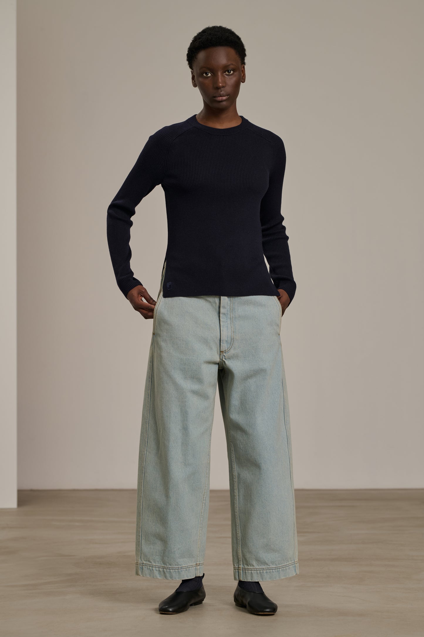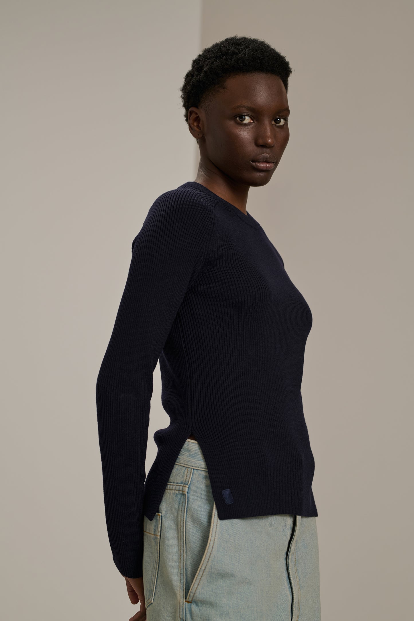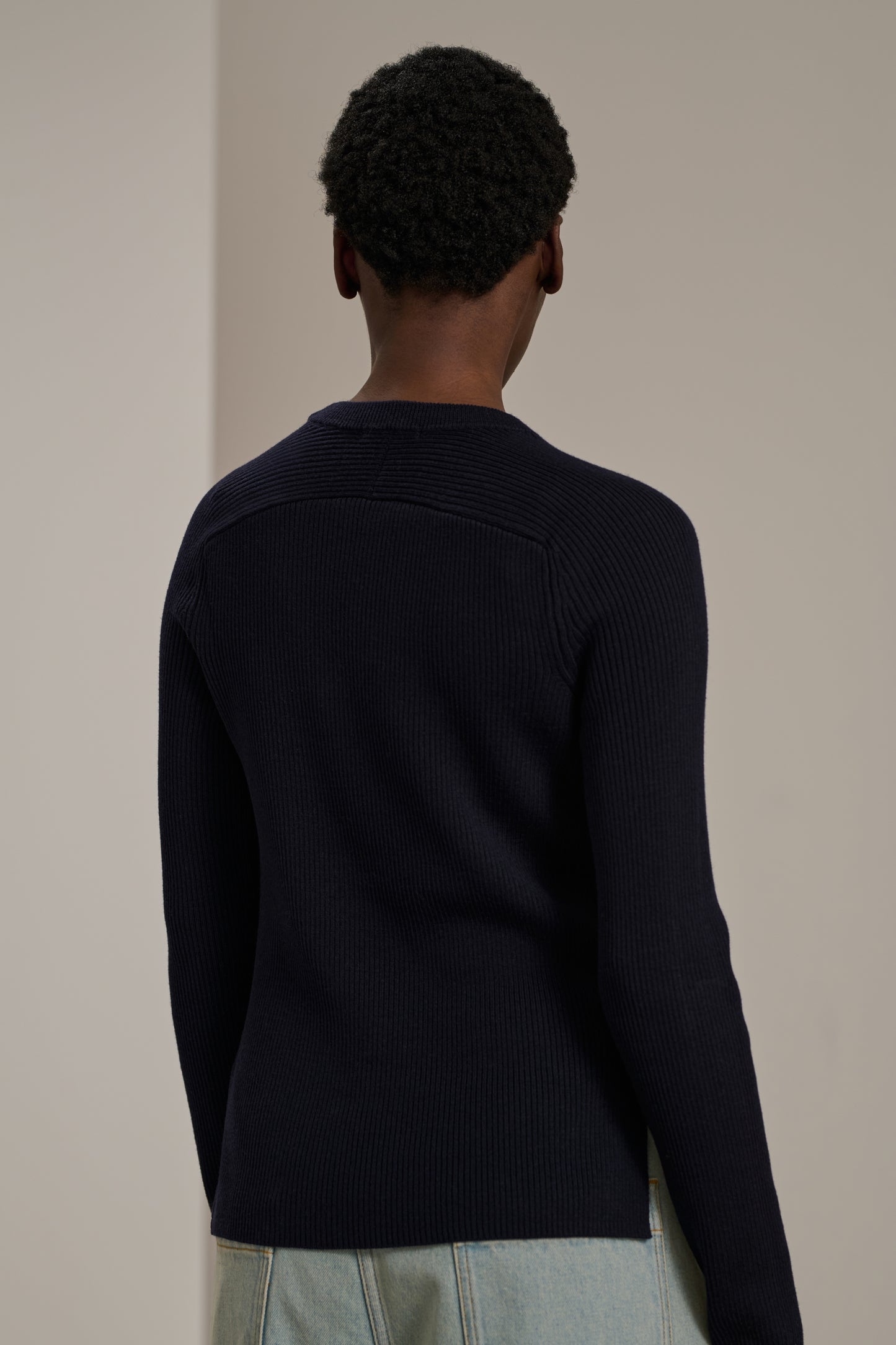 VERONA est un pull col rond en maille côtelée extensible à la coupe près du corps. Il peut être porté à même la peau ou superposé à une chemise longue. Il fait partie de notre ligne de tricots brodés du monogramme "S". Cette version est en laine mérinos fine et chaude. Une version d'été tricotée en coton et lin existe également.