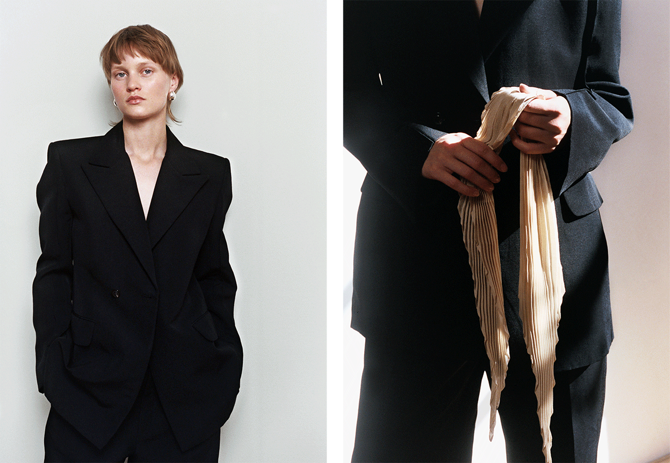 Un tailleur oversize preso in prestito dal guardaroba maschile si affianca a un abito bustier in lana dalle linee essenziali. La pelle scamosciata riscalda il corpo, mentre le pelli diventano luminose, in un verde oliva intenso o in un nero laccato. La maglia a trama fine scivola delicatamente sulla pelle. Le décolleté Théa color avorio, la borsa verniciata Suzanna e il foulard di seta plissettato completano questo look sofisticato e sobrio.