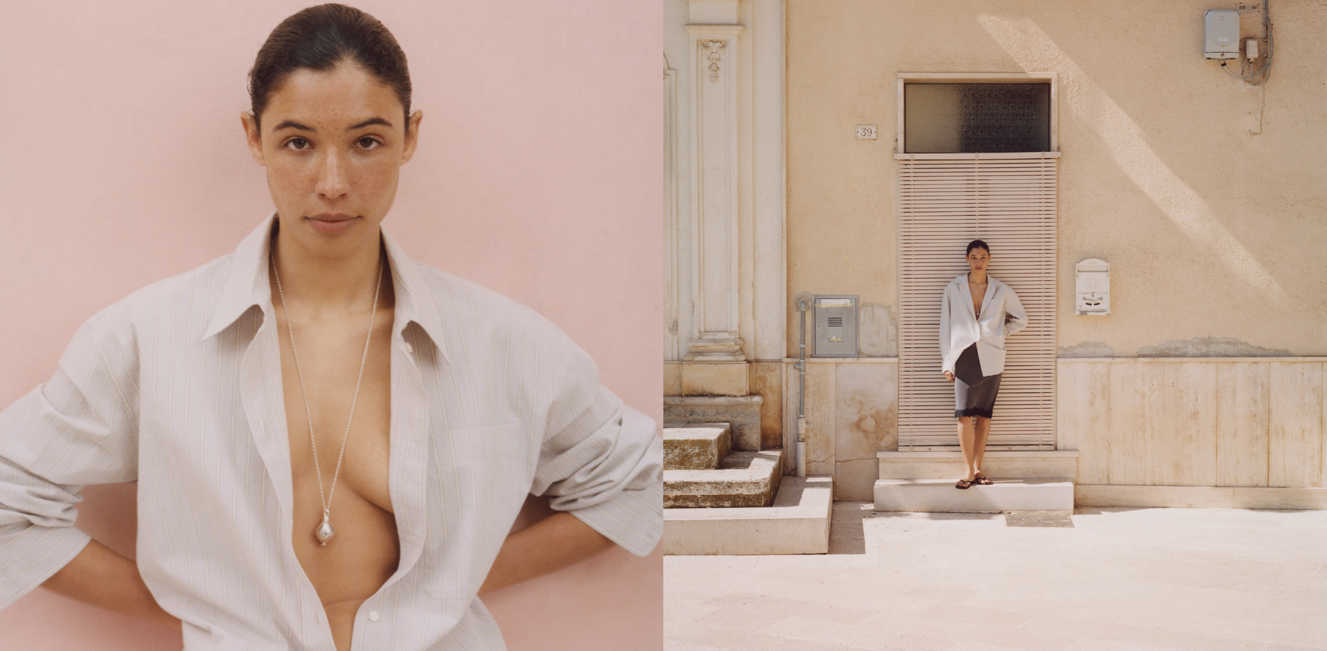L'estate si veste di tonalità marroni e pastello, accarezza la pelle sotto l'ampiezza di una camicia di popeline socchiusa, la disinvoltura di un foulard annodato su un top o la delicatezza di un abito di seta. La collezione e le sue trame si rivelano attraverso silhouette scolpite da una luce languida.