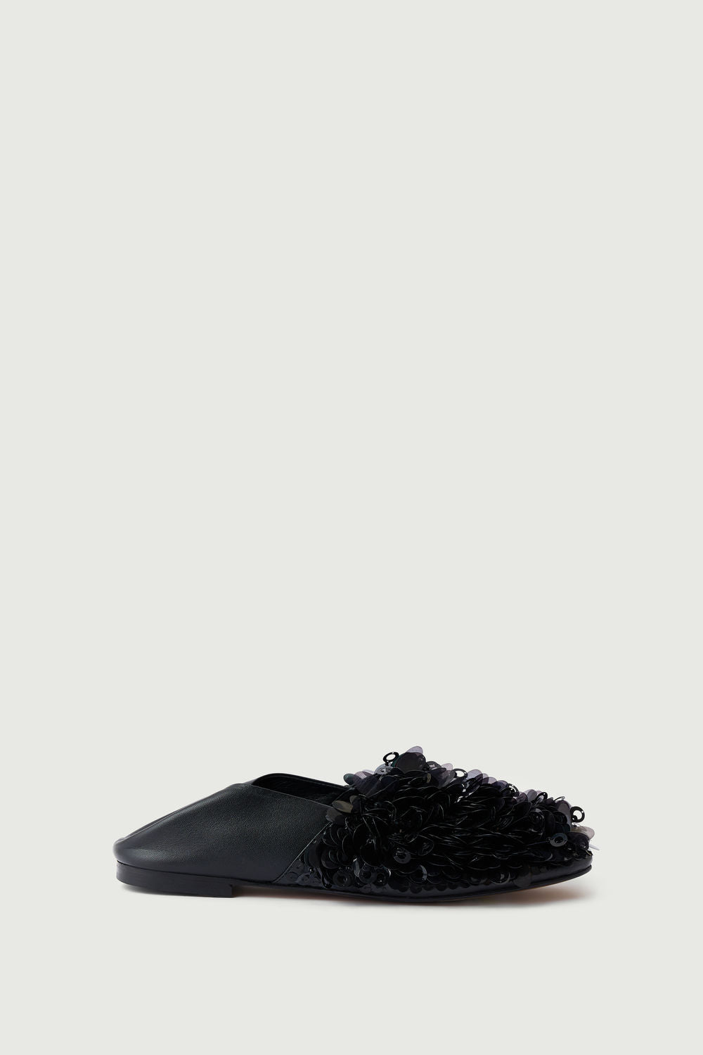 - Pantofole piatte in pelle nera e paillettes ricamate
