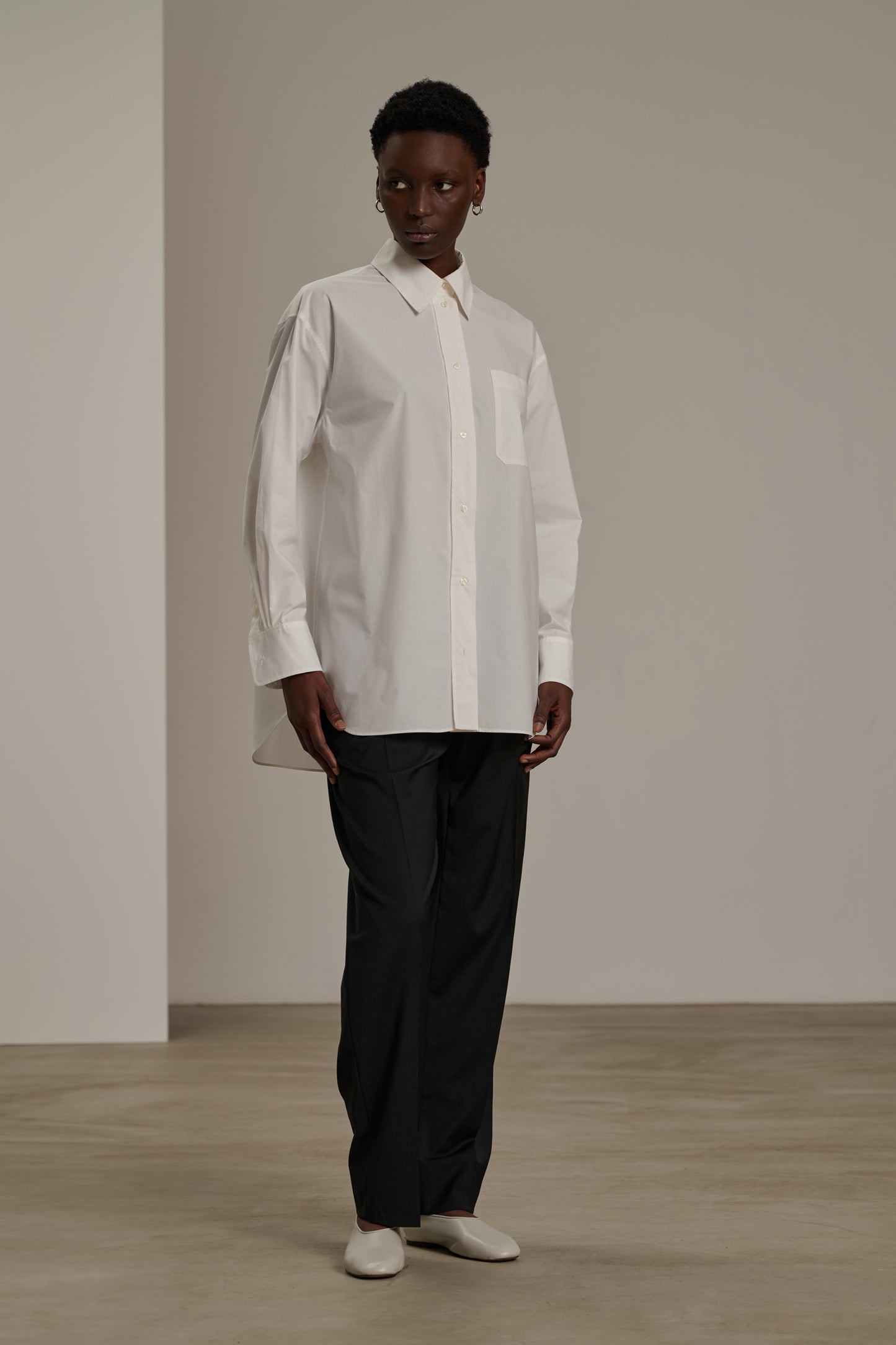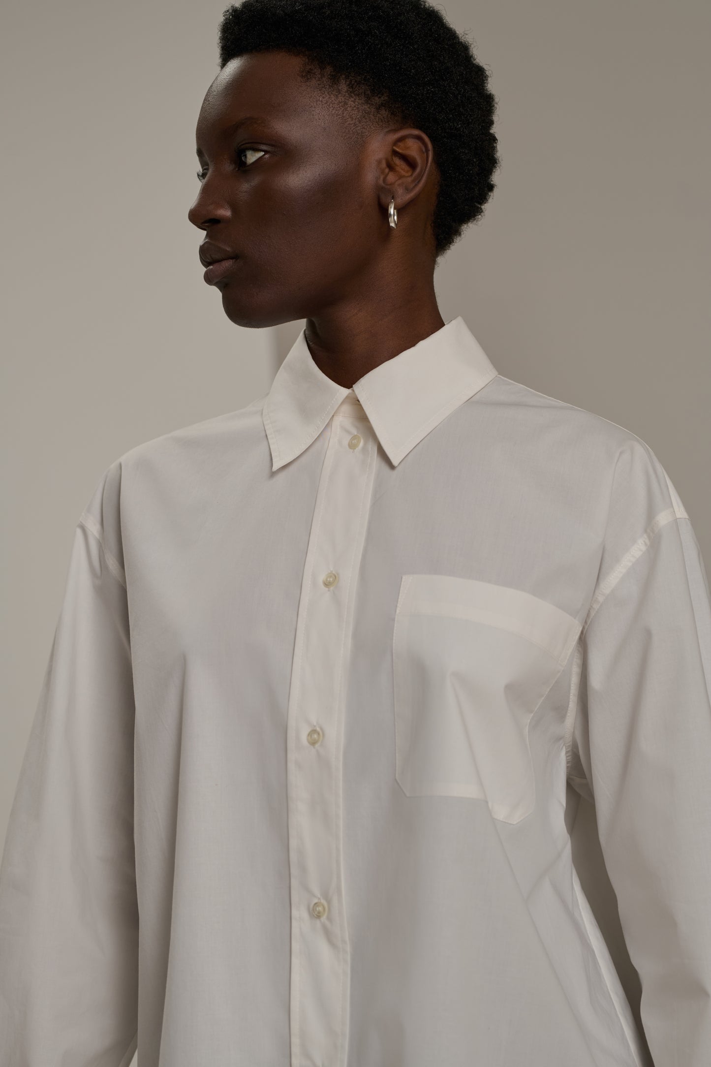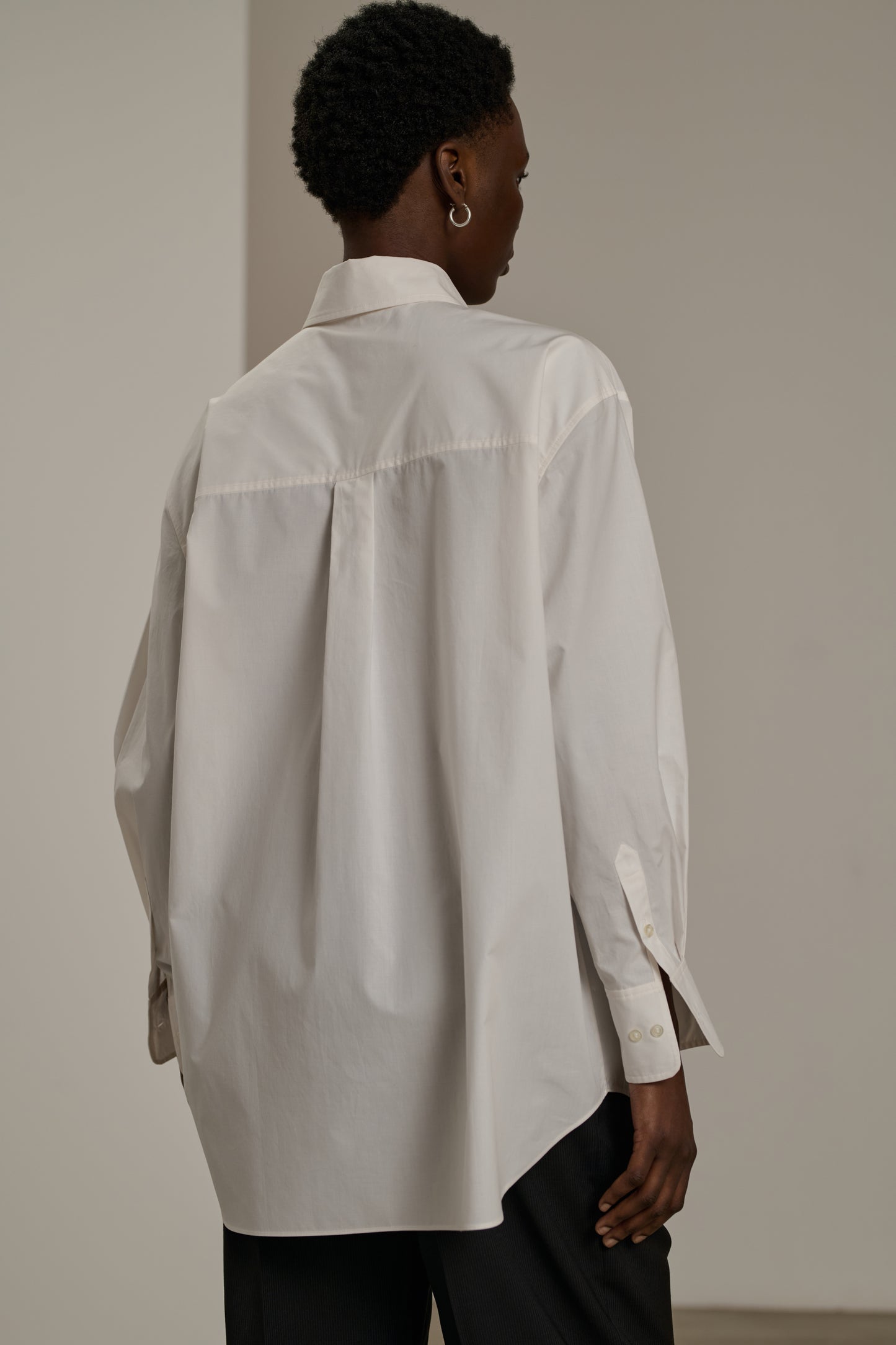 CARLOTTA è una camicia in popeline bianco crema che gioca su un taglio oversize ispirato al guardaroba maschile, per uno stile disinvolto ed elegante.