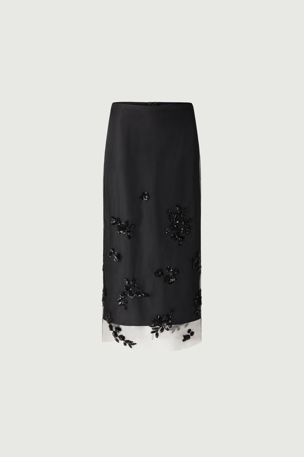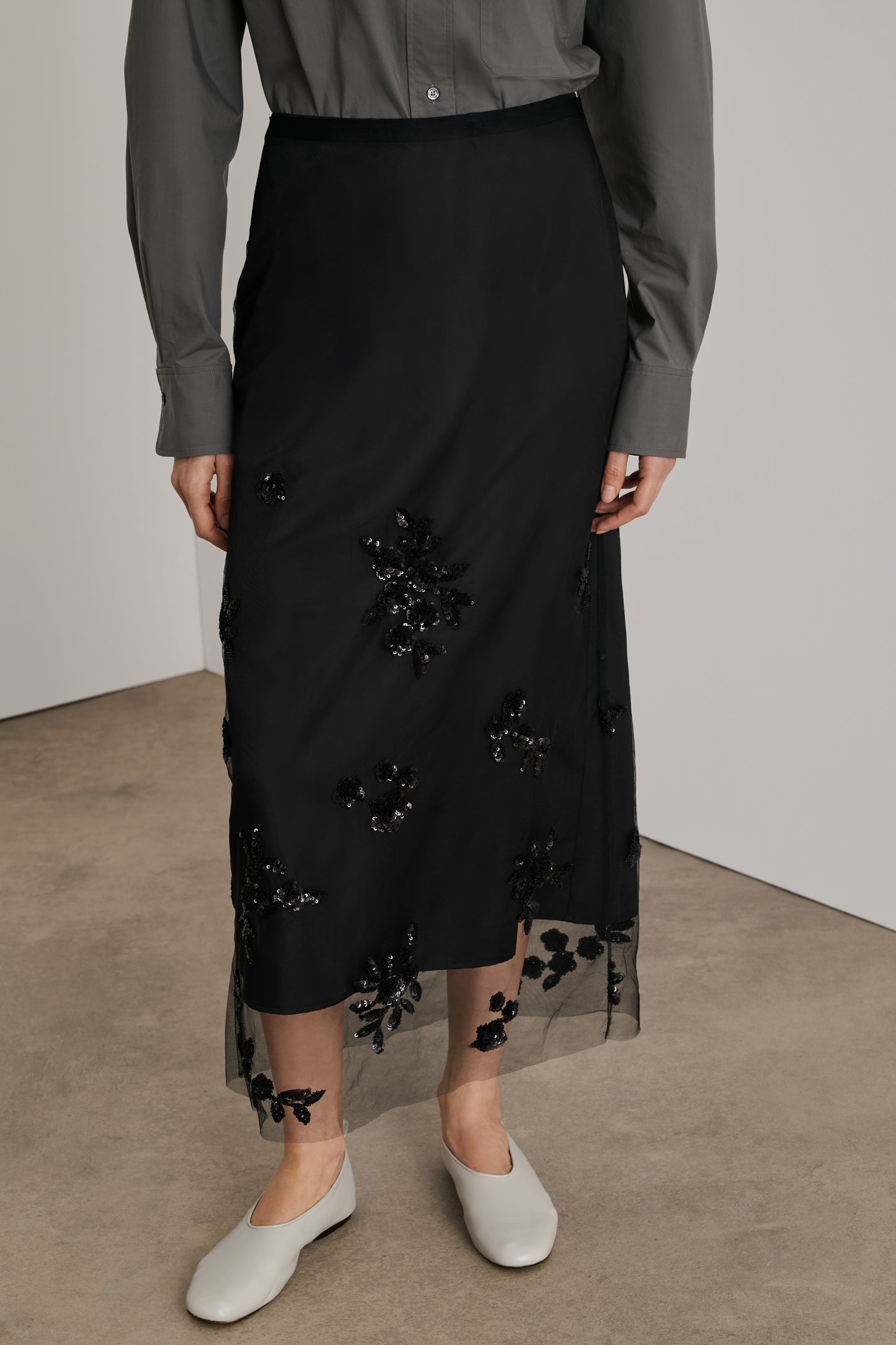 GRACE è un'elegante gonna lunga in tulle e ricami applicati. Realizzata in due parti: una sottogonna foderata per limitare le trasparenze e una gonna in tulle nero ricamata con elementi floreali in paillettes nere dal basso verso l'alto. Si chiude con due cerniere invisibili. Questa gonna versatile può essere indossata con o senza sottogonna, a seconda di quanto si voglia osare.