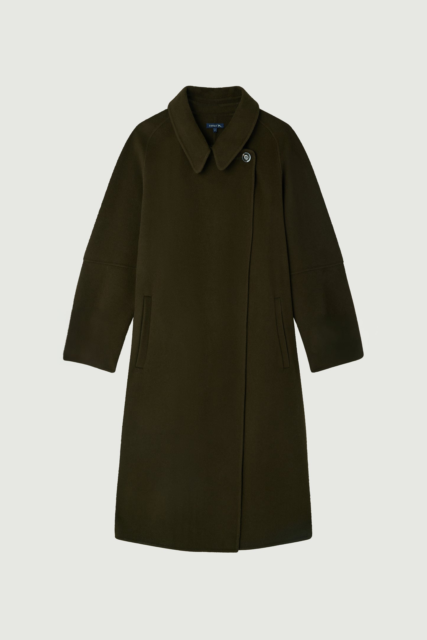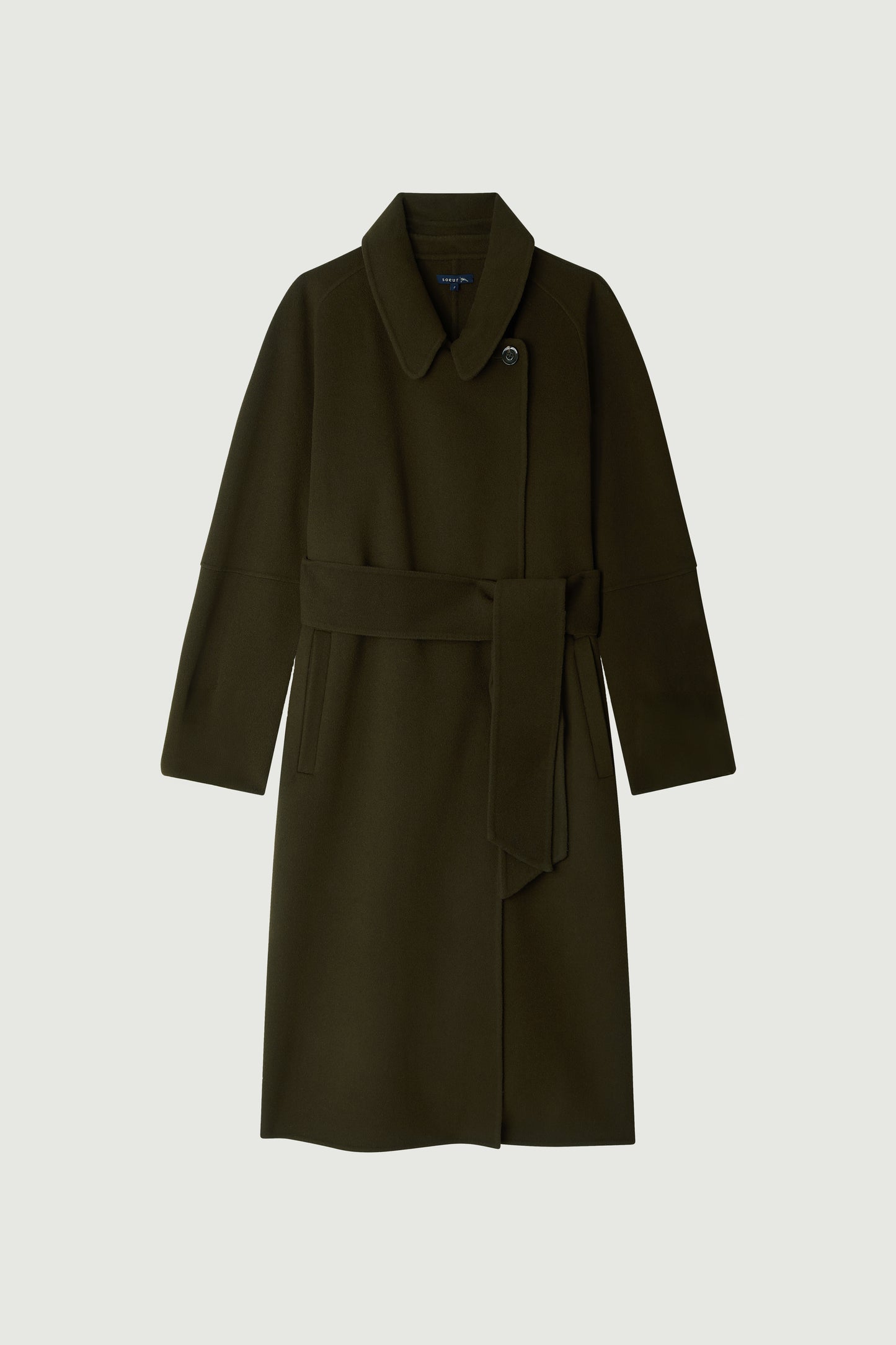 CHAMBERY è un cappotto lungo con un volume che segue la silhouette, realizzato in lana doppia faccia in una tonalità di kaki scuro. Dispone di un colletto amovibile con bottoni e si chiude con una cintura rimovibile per una vestibilità perfetta. In uno spirito minimalista, le cuciture nascoste mettono in risalto il taglio sofisticato e senza tempo.