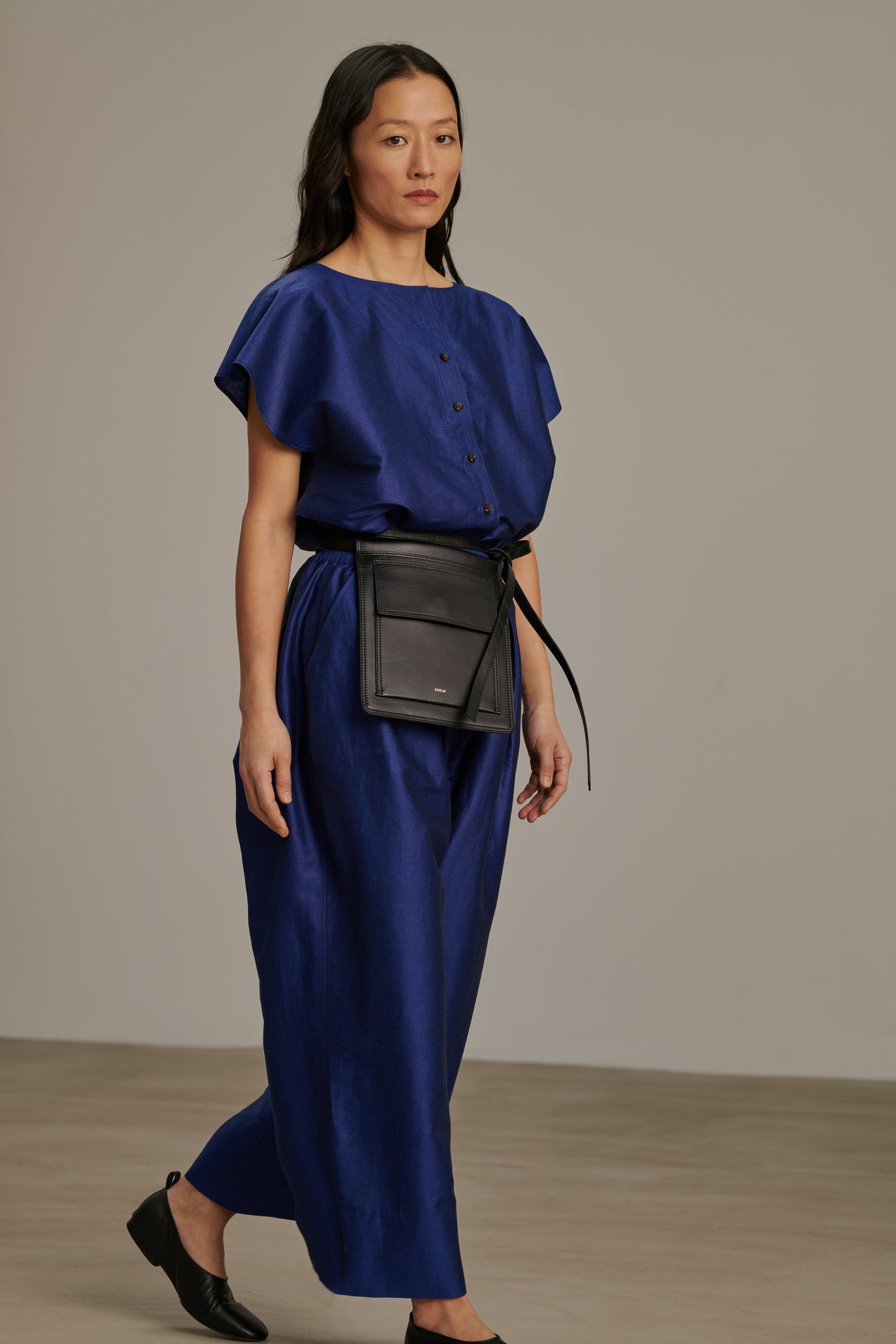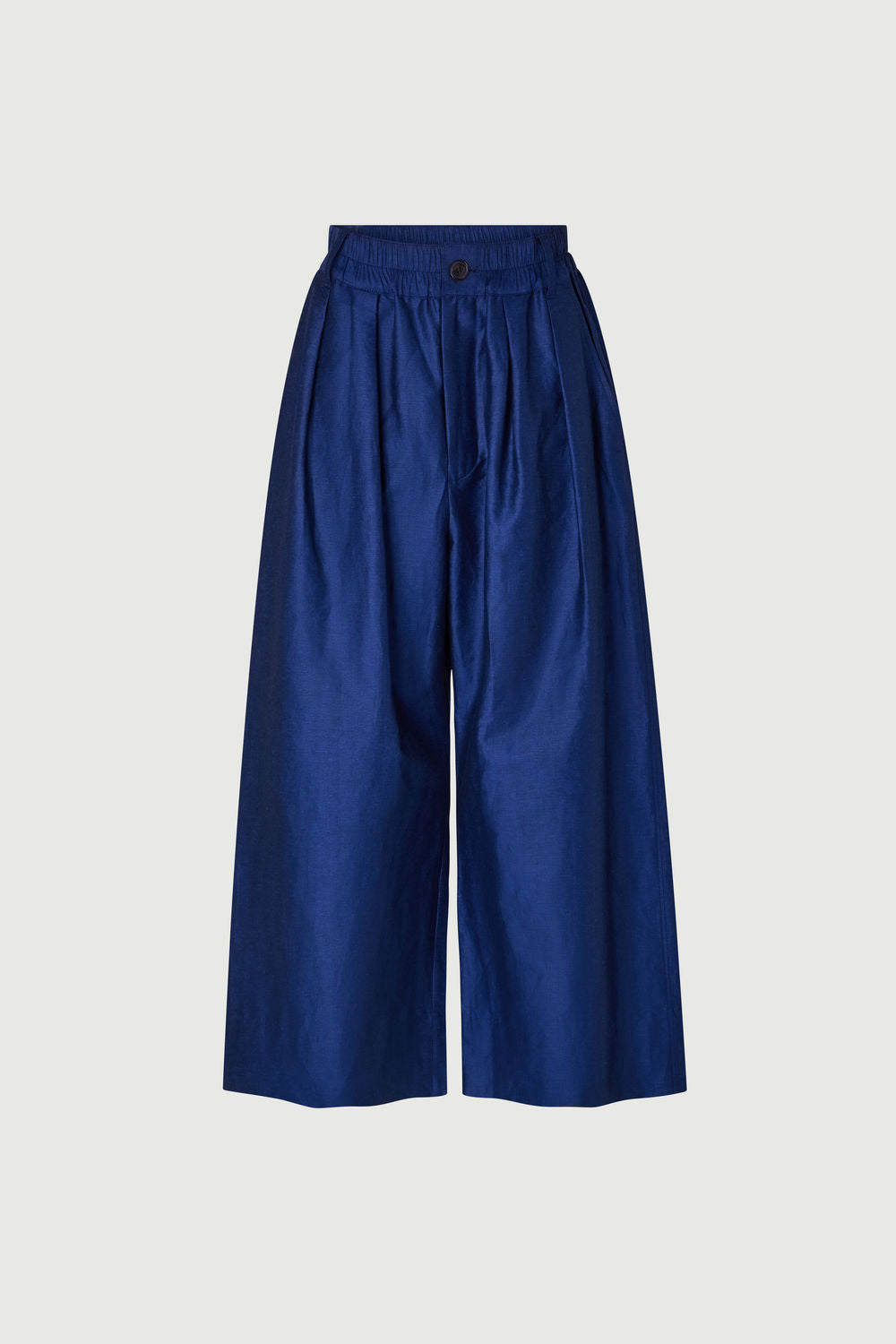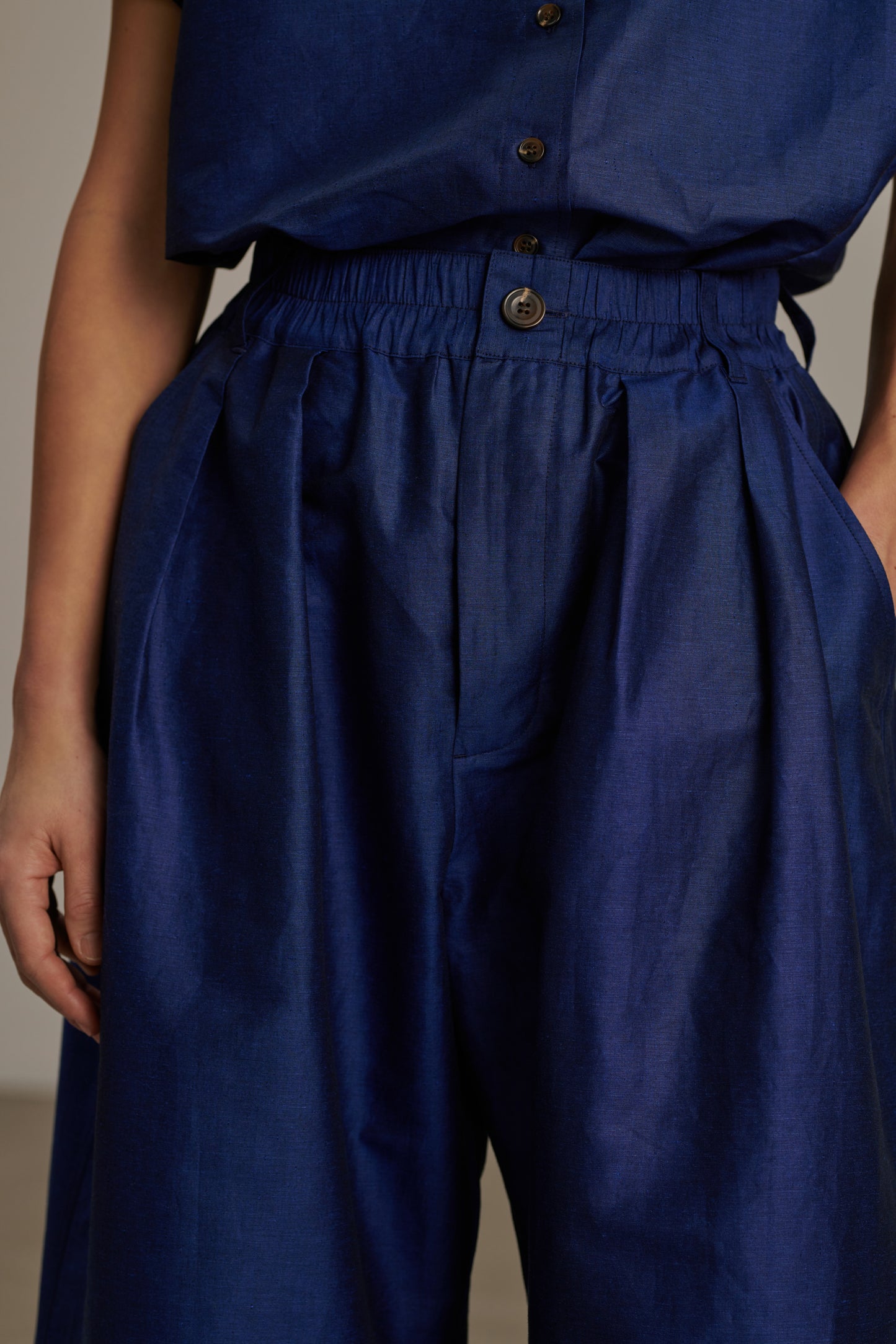 CAMERON è un pantalone ampio, con gamba arrotondata. Il suo tessuto è un cotone lino chintz, un materiale elegante e leggermente lucido.