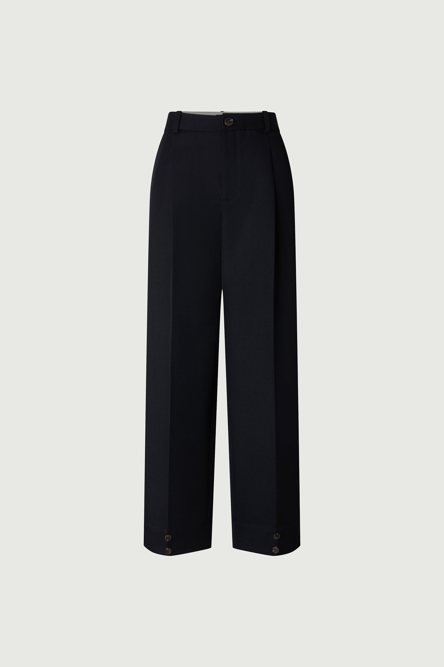 FELIX è un pantalone con pinces a vita alta. Da anni un capo indispensabile del guardaroba Soeur, è riconoscibile grazie al sistema di abbottonatura che permette di indossarlo in due modi: chiuso, stringe la parte inferiore della gamba creando una silhouette arrotondata, aperto ha una gamba larga e dritta. Questa versione in flanella di lana color nero si abbina a tutto.