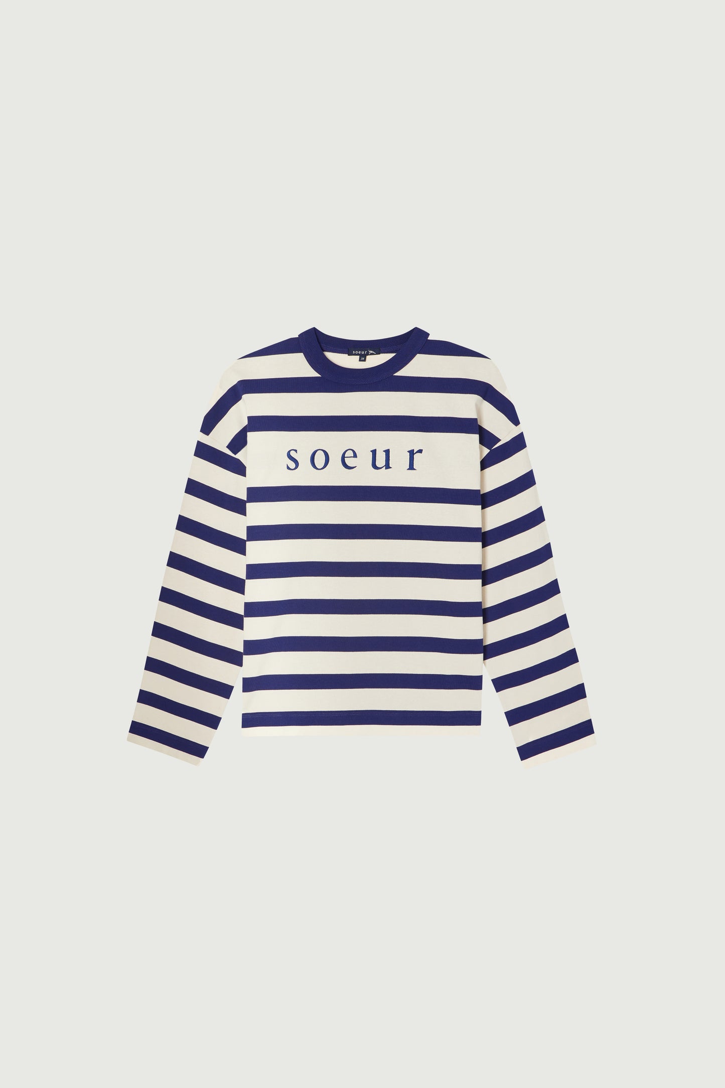 T-shirt marinière a maniche lunghe con logo “Soeur” ricamato in cotone ecrù e navy ecrù/navy